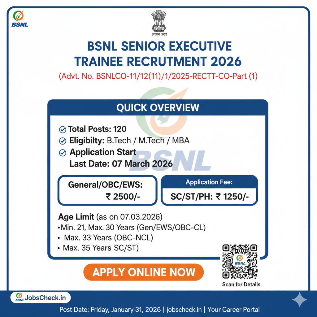 Bharat Sanchar Nigam Limited (BSNL) has released the Senior Executive Trainee Recruitment 2026 for 120 vacancies in Telecom and Finance streams.