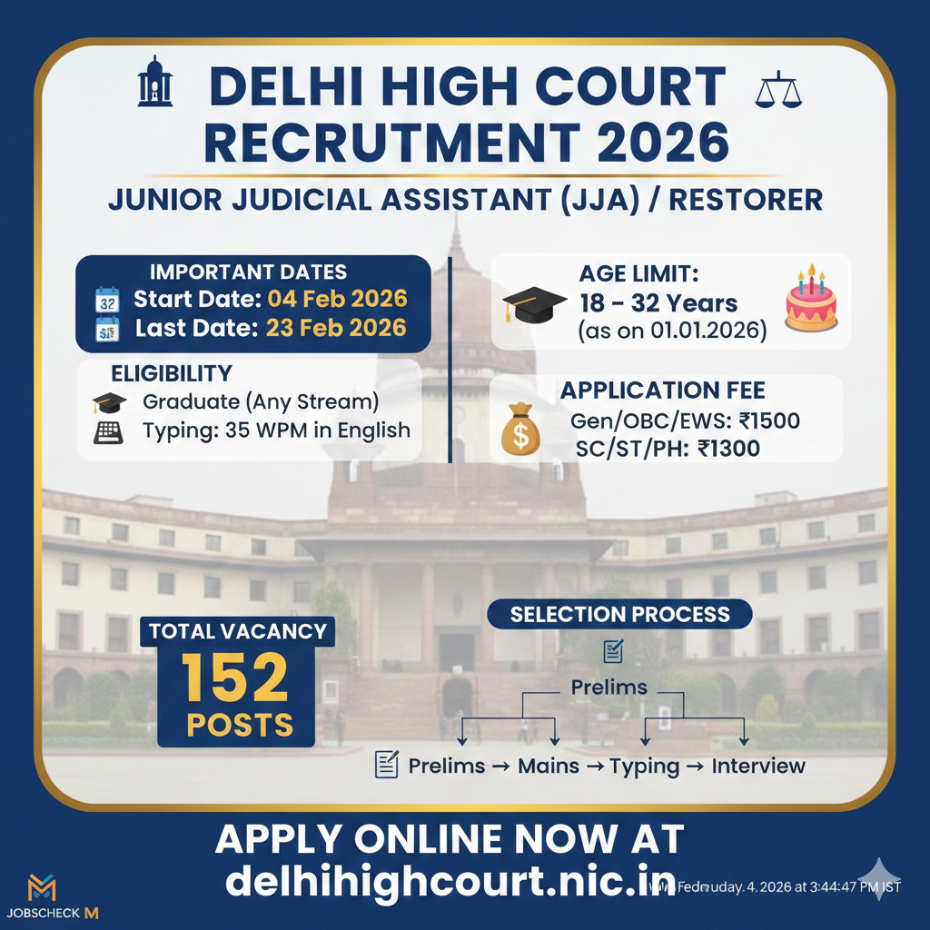 Delhi High Court (DHC), New Delhi has announced the Junior Judicial Assistant (JJA) / Restorer Recruitment 2026 for a total of 152 vacancies. This recruitment offers a valuable opportunity for graduates seeking a stable government job in the judicial sector. The online application process begins on 04 February 2026 and will remain open until 23 February 2026. Eligible candidates are advised to apply within the deadline after carefully reviewing the official notification.