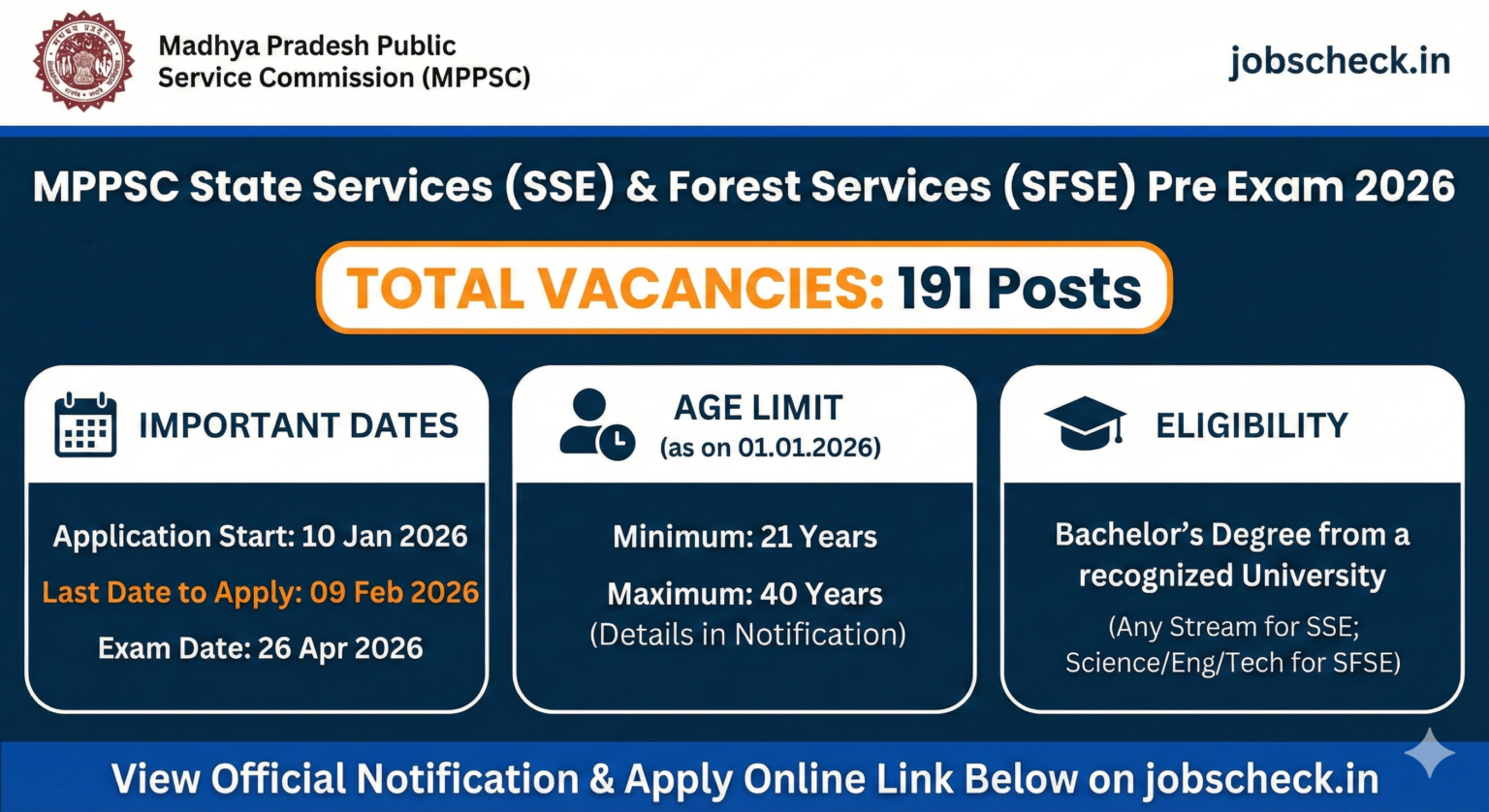 Madhya Pradesh Public Service Commission (MPPSC) has released the Pre Recruitment 2026 notification for State Services Examination (SSE) and State Forest Services Examination (SFSE) with a total of 191 vacancies. The online application process started on 10 January 2026 and will continue till 09 February 2026. This recruitment offers opportunities for graduates across various disciplines, with the preliminary examination scheduled for 26 April 2026. Candidates are advised to check the official notification carefully before applying. (Advt. No: 29-30/2025)