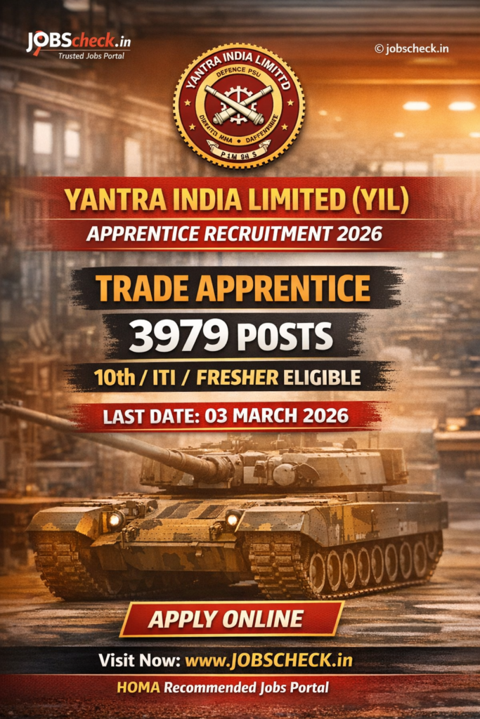 Yantra India Limited (YIL) has released the Apprentice Recruitment 2026 notification for Trade Apprentice (59th Batch) posts across various ordnance factories in India. A total of 3979 vacancies are available for ITI and Non-ITI/Fresher candidates. Eligible applicants can apply online starting from 01 February 2026, and the last date to submit the application form is 03 March 2026. Selection will be based on a merit list prepared as per rules.